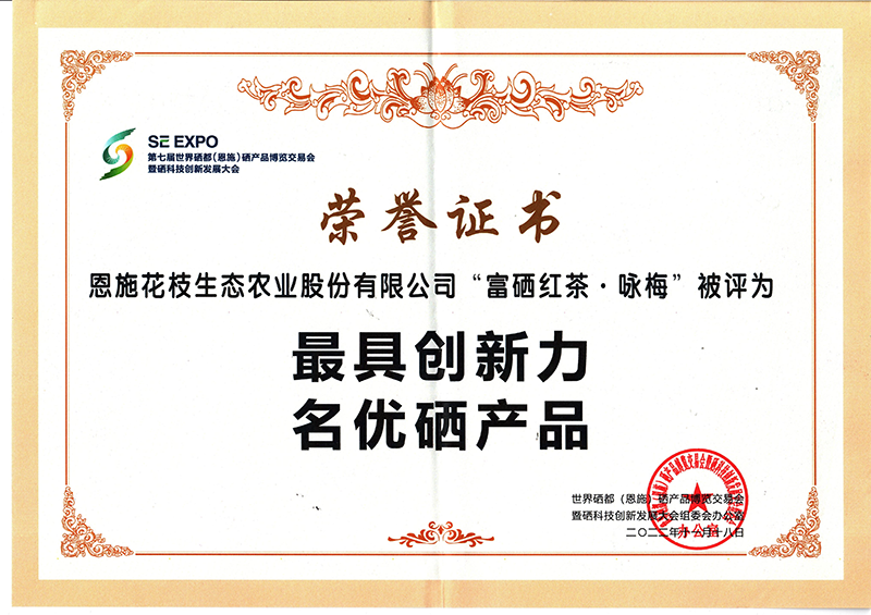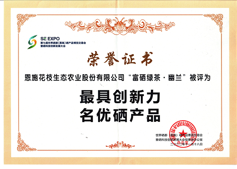 这次大会参选的名优硒产品,经过行业专家、检测机构层层筛选、评定,花枝茶业选送的“富硒红茶-咏梅、富硒绿茶-幽兰”在数百家产品激烈竞争中,脱颖而出,双双被评为“最具创新力名优硒产品奖”!